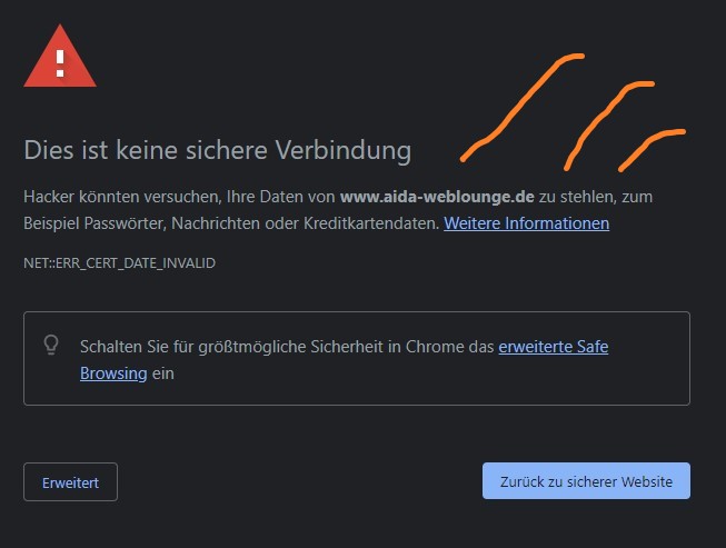 Die AIDAlounge ist über das WEB aus der MyAIDA-Club-Seite nicht „sicher“ erreichbar. Es erscheint die hier abgebildete Meldung auf dem PC.
