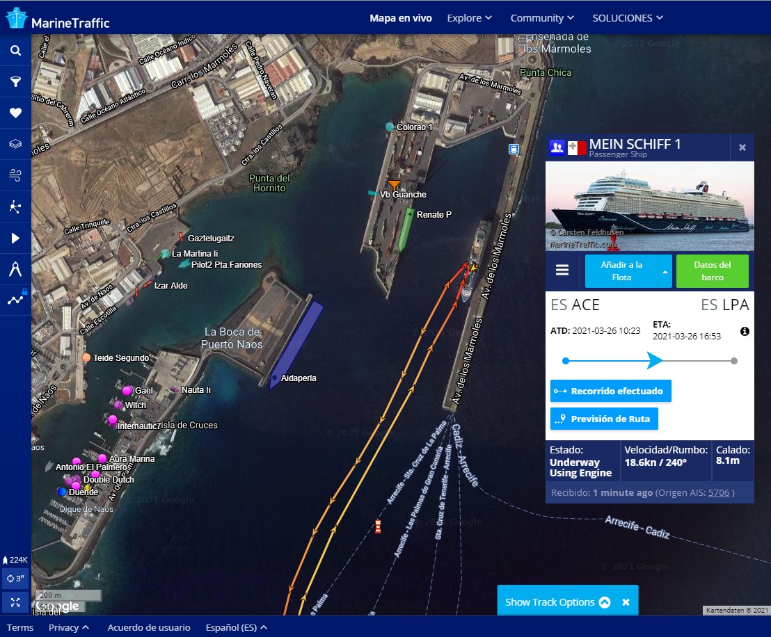 In der Nacht zum Freitag musste TUI Cruises einen Notfallstop in Arrecife durchführen. Seit dem Morgen ist die MS1 wieder auf Kurs San Sebastián de La Gomera (lt. Hafenwerwaltung).