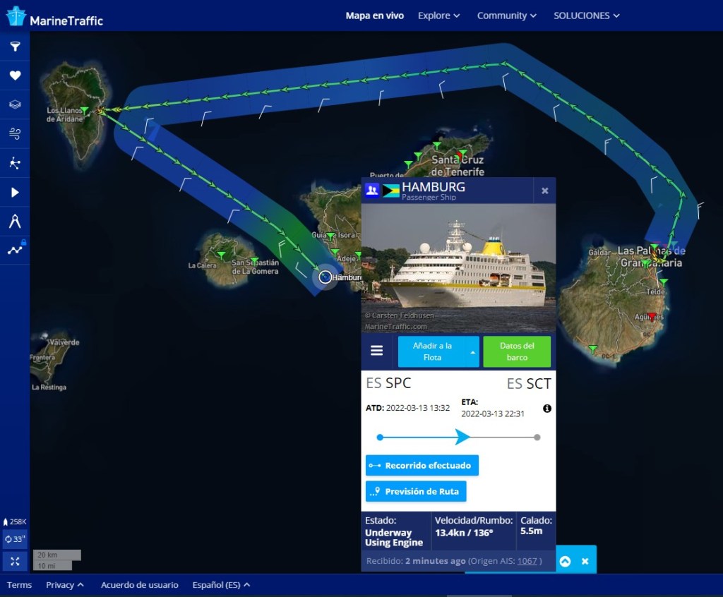El MS Hamburg llegó anoche al puerto de Santa Cruz de Tenerife y se espera que navegue en los próximos días hacia un destino de momento desconocido. Según los desvios anteriores, se puede calcular que El Hierro sea el próximo destino.