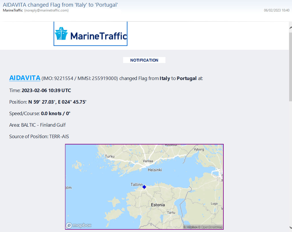 AIDAVITA (IMO: 9221554 / MMSI: 255919000) changed Flag from Italy to Portugal at: Time: 2023-02-06 10:39 UTC Position: N 59° 27.03′, E 024° 45.75′