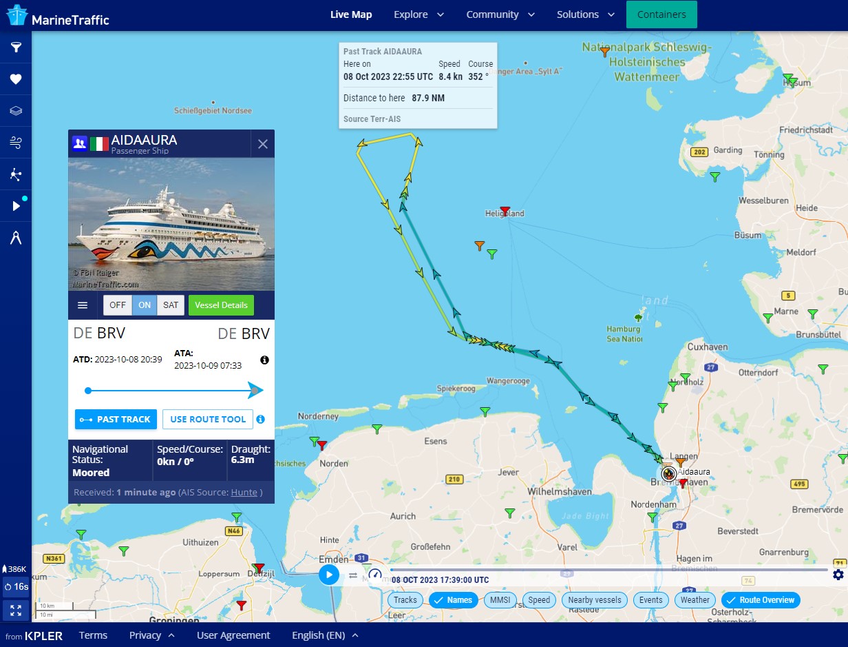 Todavía existe una actividad de traspaso entre Carnival Corp. & PLC y Miray Cruises, ya que entre el 8 y 9 de octubre se realizó una ruta que podría describirse claramente como un viaje de prueba al noroeste de Heligoland, durante la cual se alcanzaron velocidades máximas de más de 18 nudos. Quizás ahora haya más obstáculos en el camino que podrían haber causado el retraso.