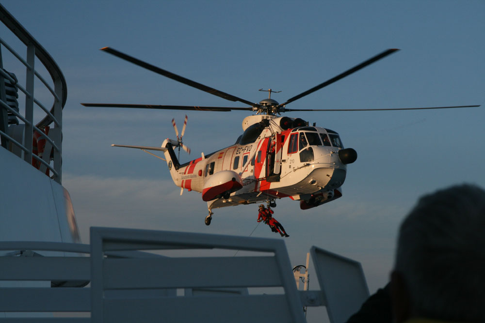Ein 61-jähriger deutscher Passagier, der sich aufgrund einer Lungeninfektion in ernstem Zustand befand, wurde per Seilwinde vom Kreuzfahrtschiff AIDAmar geborgen. Das Schiff befand sich zum Zeitpunkt der Einsatzanforderung auf der Rückkehr aus der Karibik und zwar mehr als 600 km südwestlich der Insel El Hierro. Hier an der Grenze der Einsatzreichweite konnte die Luftbergung mit Helikopter noch rechtzeitig realisiert werden.