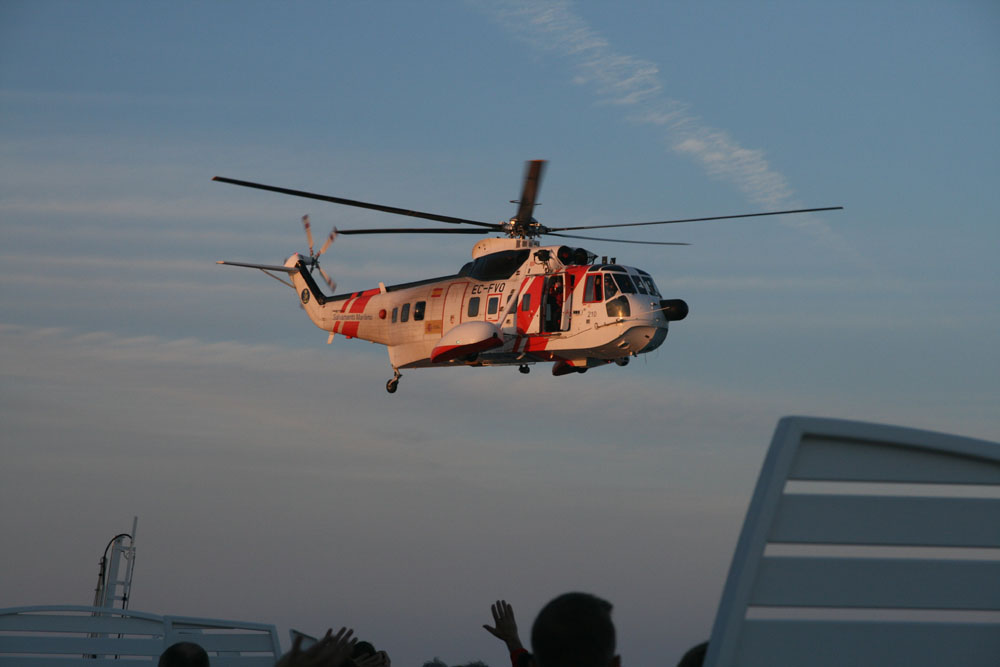 „Für diesen Einsatz wurde auch ein D.4 „VIGMA“-Flugzeug derselben Staffel aktiviert, das den Hubschrauber mit Informationen über Winde in großer Höhe versorgte, mit dem Ziel, seinen Flug zu optimieren, um den Treibstoffverbrauch zu minimieren und die Geschwindigkeit zu maximieren. Das Flugzeug hatte zuvor Kontakt mit dem Kreuzfahrtschiff aufgenommen, um das Manövrieren des Hubschraubers bei der Ankunft zu erleichtern. Nach Verlassen des Funkbereichs konnten die eingesetzten SAR-Luftressourcen dank der Satellitenkommunikationskapazität (SATCOM) mit dem ARCC Canarias in Kontakt bleiben und so eine Koordination in Echtzeit durchführen. Das Flugzeug gab dem Schiff die vom Helikopter benötigten Anweisungen hinsichtlich des Kurses und der Geschwindigkeit, die während des Manövers einzuhalten waren, um die Bergung an der Seilwinde zu erleichtern.