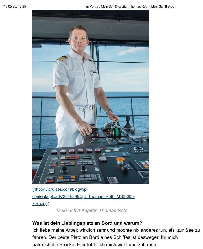 El operador de cruceros para el mercado alemán TUI Cruises en Hamburgo supuestamente ha confirmado a algunos productos comerciales en redes sociales en Internet que el capitán Thomas Roth, también conocido como Tom Roth, habría dejado la empresa cinco semanas después del acto de bautizo del Mein Schiff Relax. Ya se dice que tiene nuevos planes de carrera, aparentemente incluso más allá de su experiencia náutica.