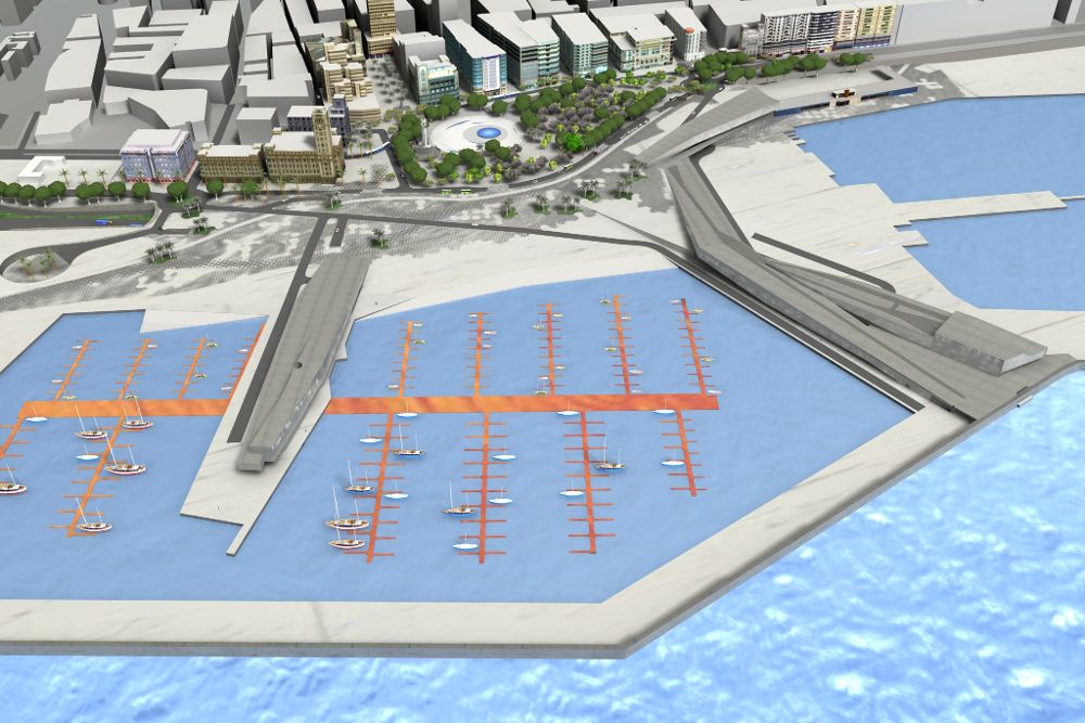 En la siguiente imagen podemos ver la propuesta aprobada por las administraciones para la construcción del edificio portuario „Marina del Atlántico“ destinado a veleros y otros yates. Sin embargo, aún debe trabajarse en detalle y, sobre todo, las áreas peatonales deben estar claramente diseñadas.