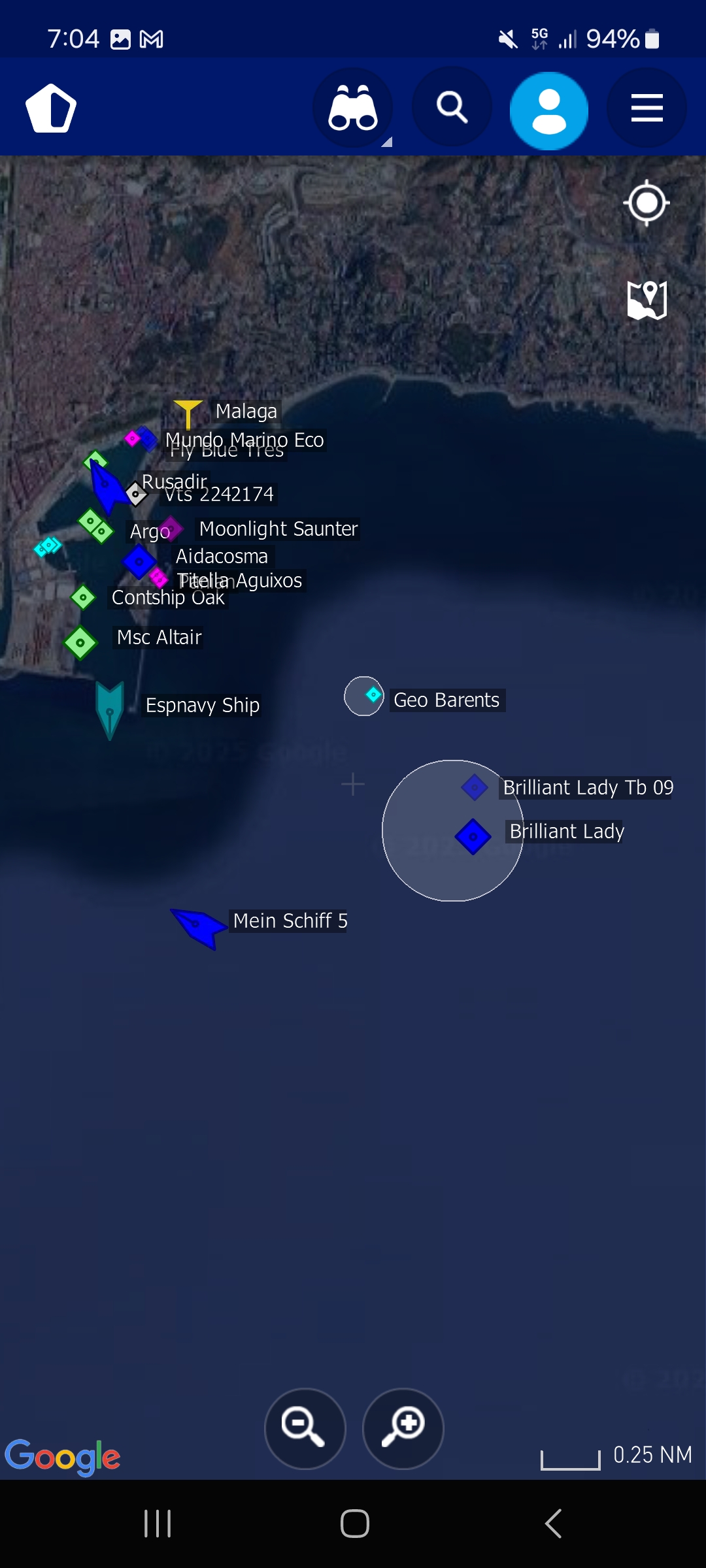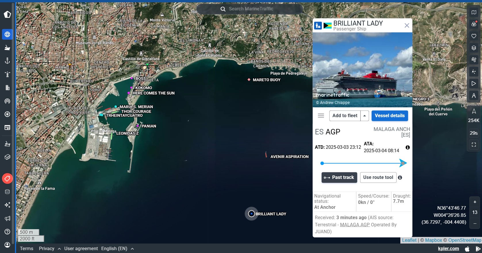 Ach ja, noch etwas. Der offizielle Name der geduldigen Dame auf Reede vor Málaga ist Brilliant Lady. Achten Sie bitte auf die Schreibweise.