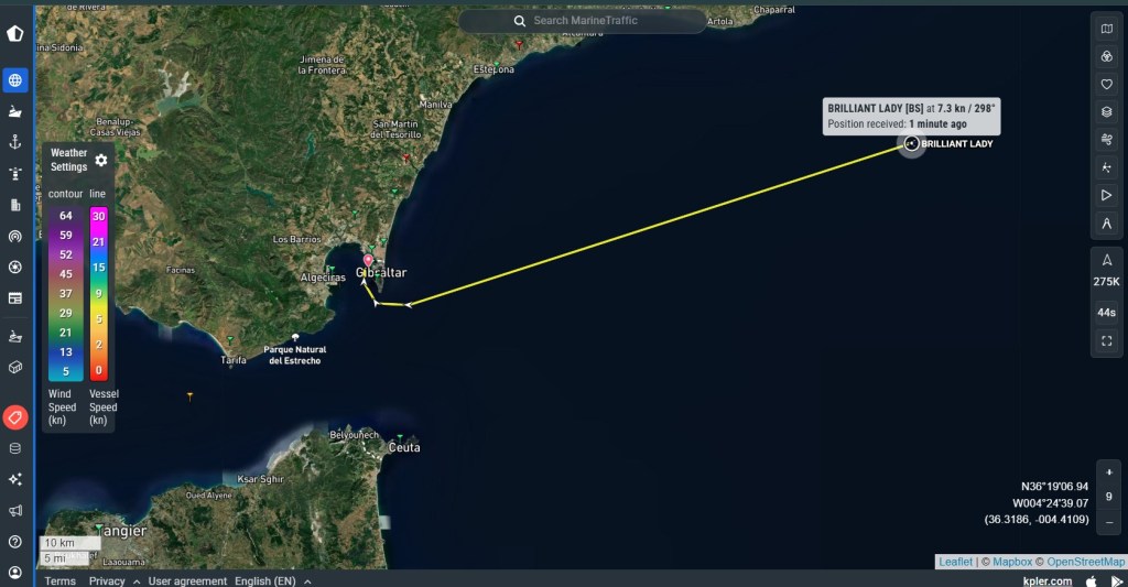 Am 20. Mai von 5 bis 18 Uhr gab es einen weiteren Aufenthalt im Hafen von Málaga. Auch für eine Stippvisite in Gibraltar war sie zwischendurch unterwegs. Die Brilliant Lady bewegt sich … und mittlerweile häufiger ! Was hat das zu bedeuten?