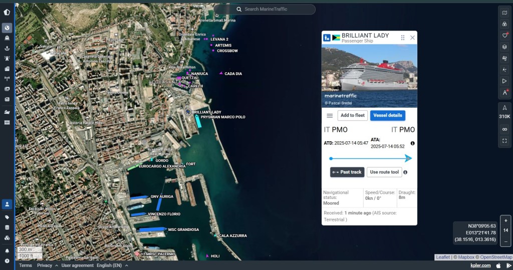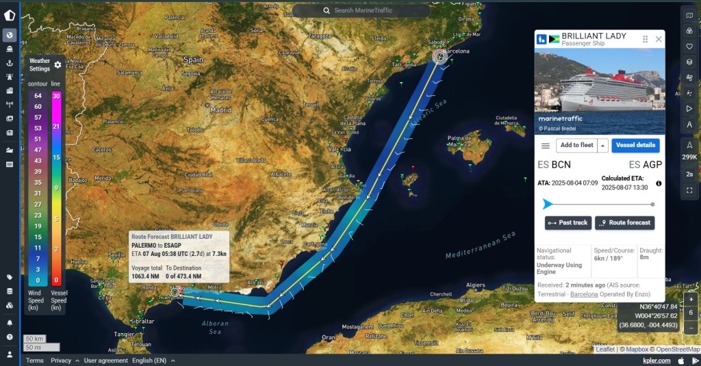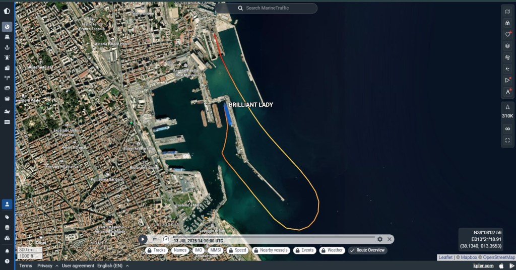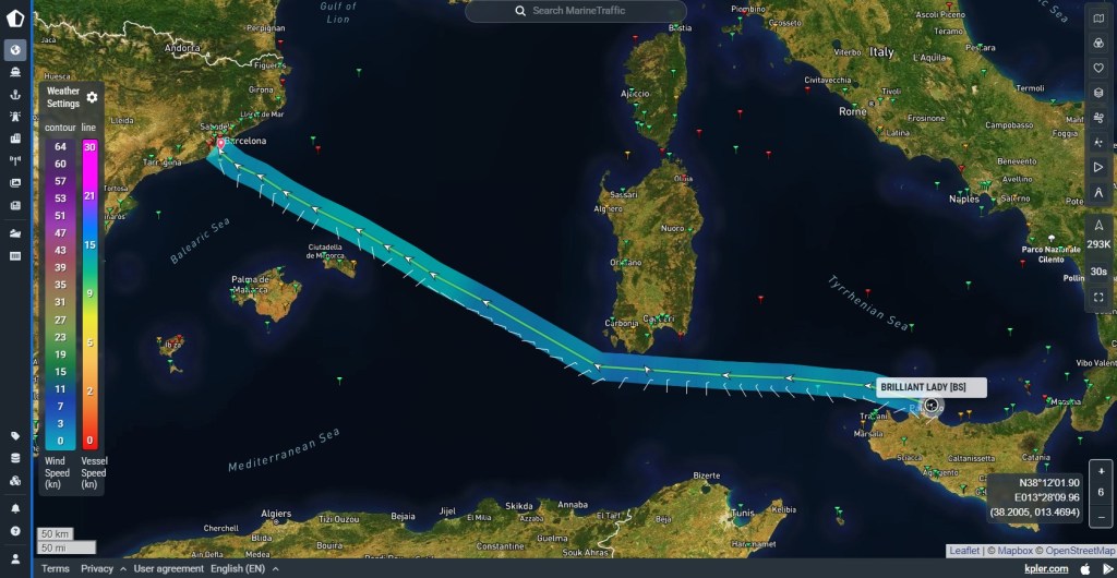 Heute Abend hat die Brilliant Lady sich vom Anleger im Hafen von Palermo auf den Weg nach Barcelona begeben. Damit geht es zunächst nicht zu dem vertrauten Ruheplatz vor Málaga.