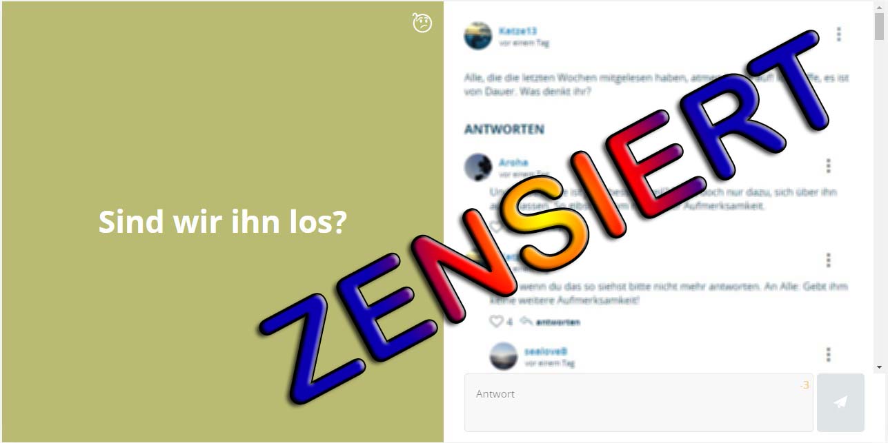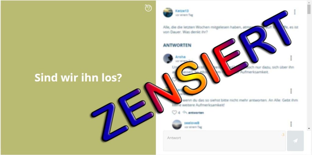 Zum folgenden: Fragenfeld >>> ein zensierter Text – MAL WIEDER. Der Interimsmoderator hat keinen Plan und keine Grundlage fairen Handelns. Vielmehr unterstützt er die Aufwiegelung und Diffamierungen der immer selben Provokant/innen. Das war mal anders.