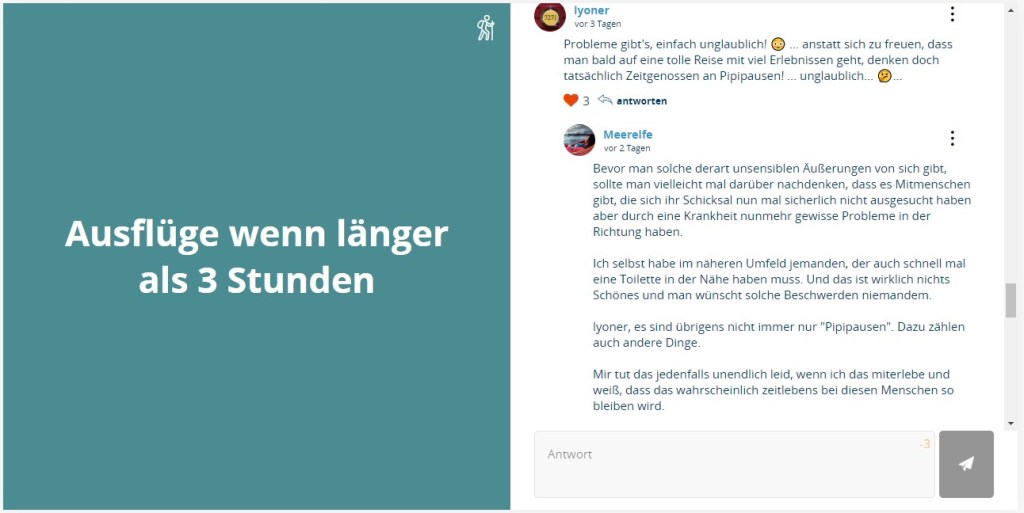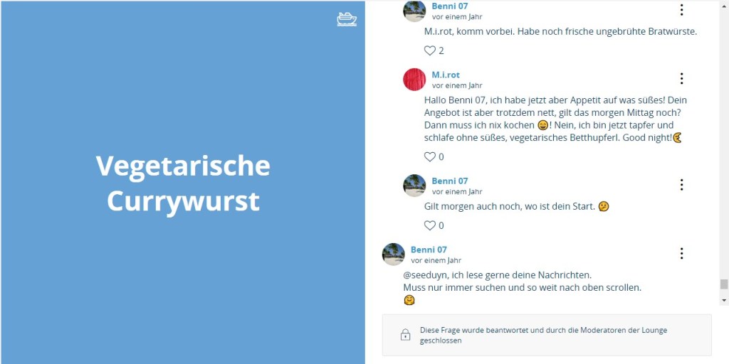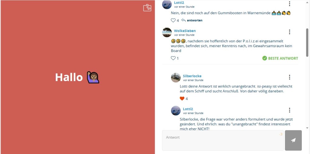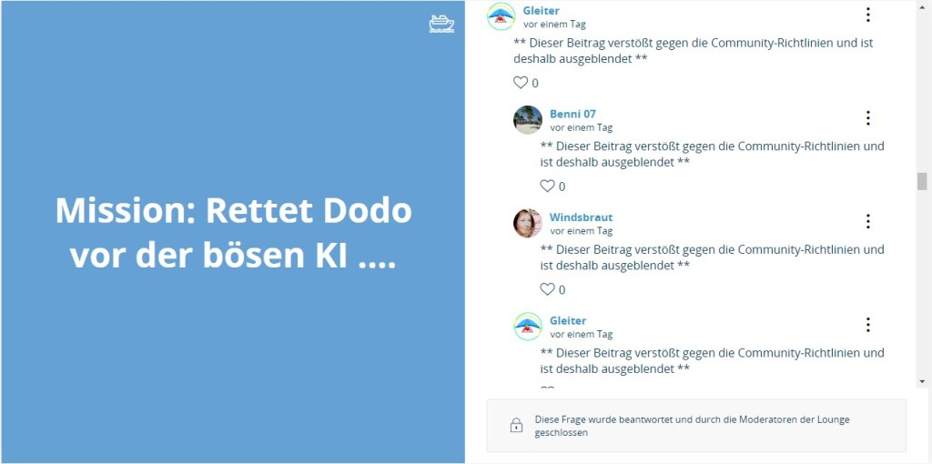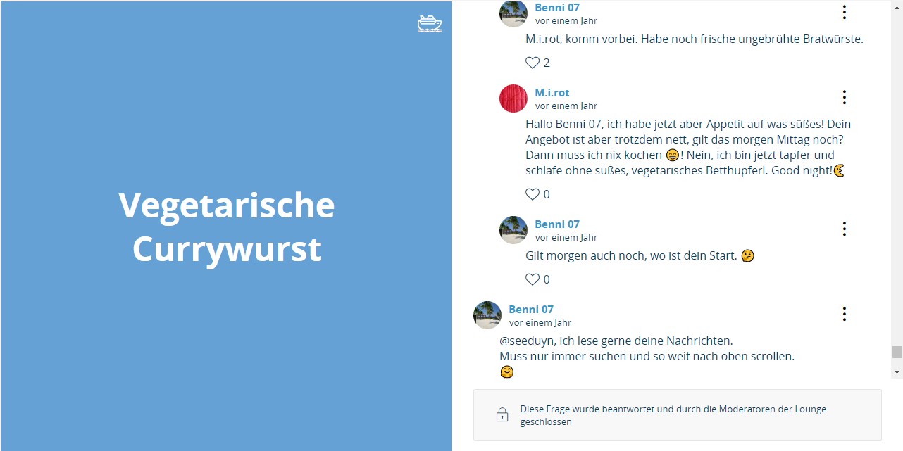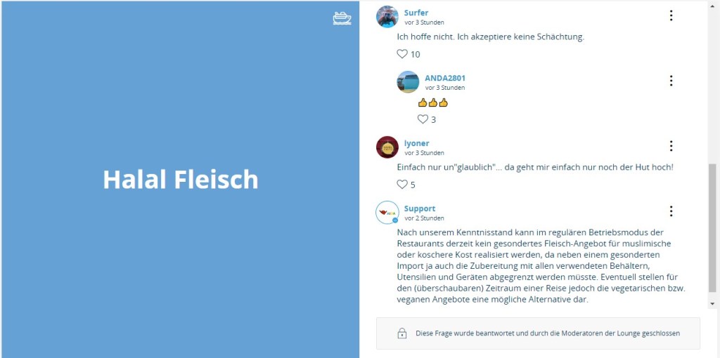 Gleichzeitig wurde also bekundet, nicht die Kreuzfahrt betreffende „persönliche Gedanken“ der Nutzer konsequent zu enfernen. Weder diese Absicht noch eine erschöpfende Rückmeldung zum „Fehler“ der nicht wirkenden Schreibsperre bei Fragenschliessung wurden bisher in die Tat umgesetzt.