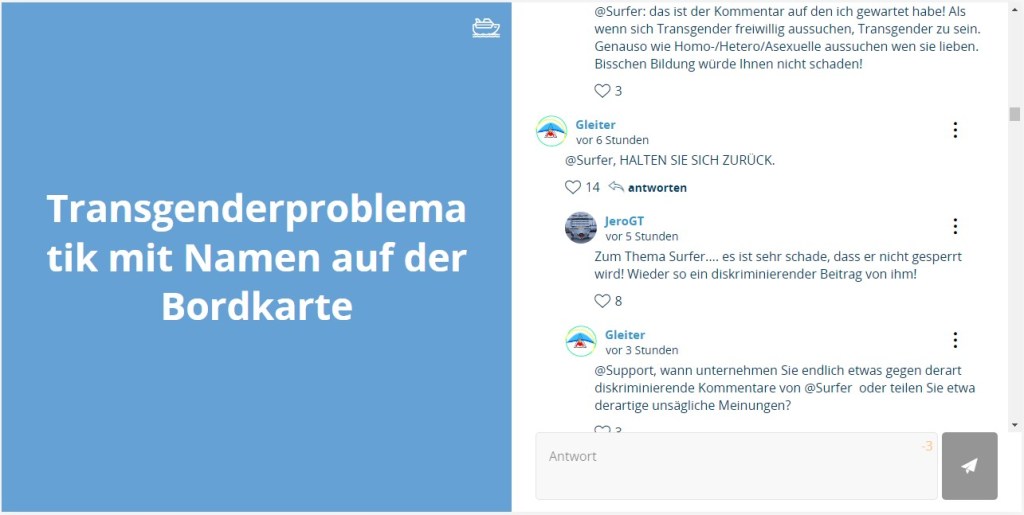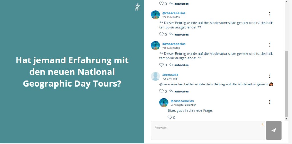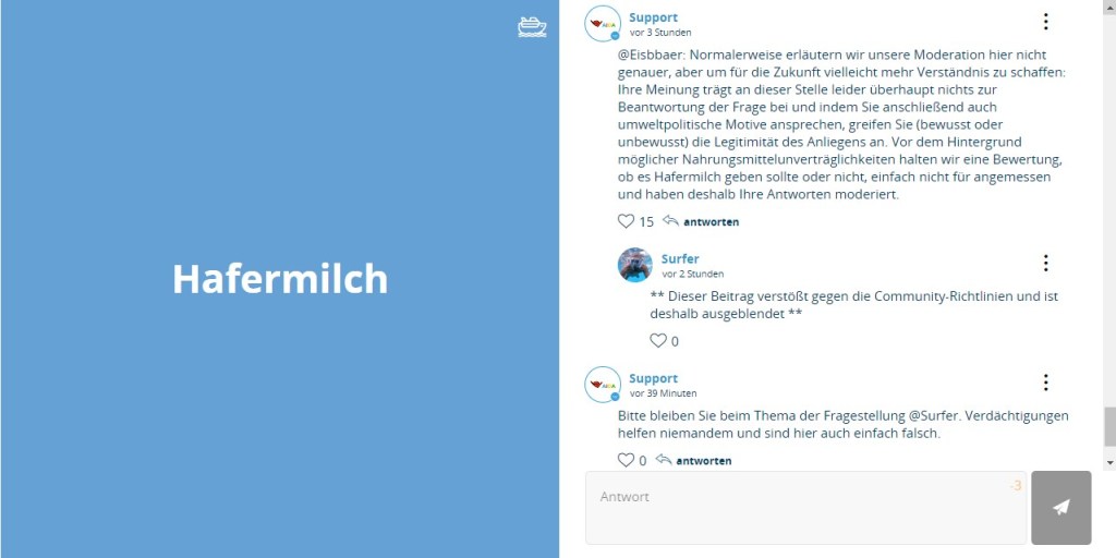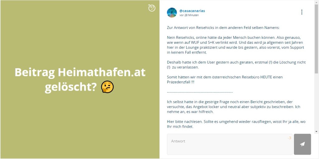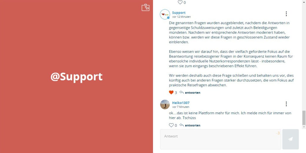 Der Verlauf des Fragenfeldes gab bis zu ihrer beabsichtigten Nennung der Reiseroute keinerlei Anlass zu dem Vorgehen, bei dem direkt im Text mehrerer User unbegründet durch den Support eine Art „Zensur“ erfolgte. Eine Erklärung des möglicherweise irrtümlichen Handels hat der Support mehrfach verweigert.