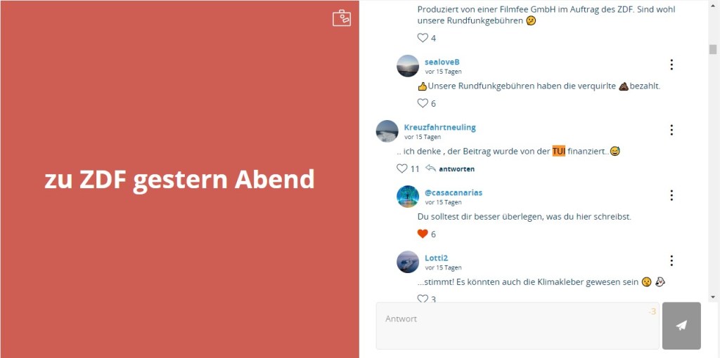 Demzufolge ist allen damit gedient, wenn in einem oder mehreren Foren die eigenen Kreuzfahrtangebote, die vermarktet werden müssen, ausreichend thematisiert werden. Neben der Werbewirkung der positiven Darstellung in Kommentaren wird man dann auch Kritik und Geringschätzigkeit hinnehmen müssen – im krassesten Fall gehören auch Hohn und Spott dazu. Aber das wäre ja nichts Neues, denn damit sind digitale Medien ohnehin üppig gefüllt.