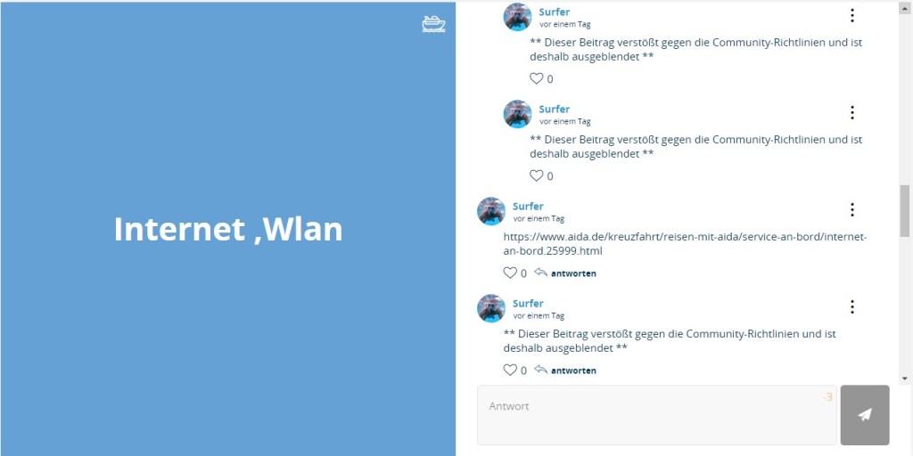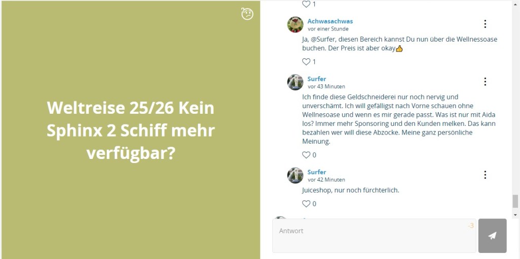 Angebliche Absprachen zu einer Sammelklage gegen AIDA-Cruises innerhalb der AIDA-Lounge haben den Support veranlasst, unverständliche Schritte zu unternehmen. Eine neue Userin, die an diesem Thema nicht beteiligt gewesen war, wurde durch Blockierungen ihrer Frageninhalte zu der Thematik Weltreise in diesen Generalverdacht hineingezogen.