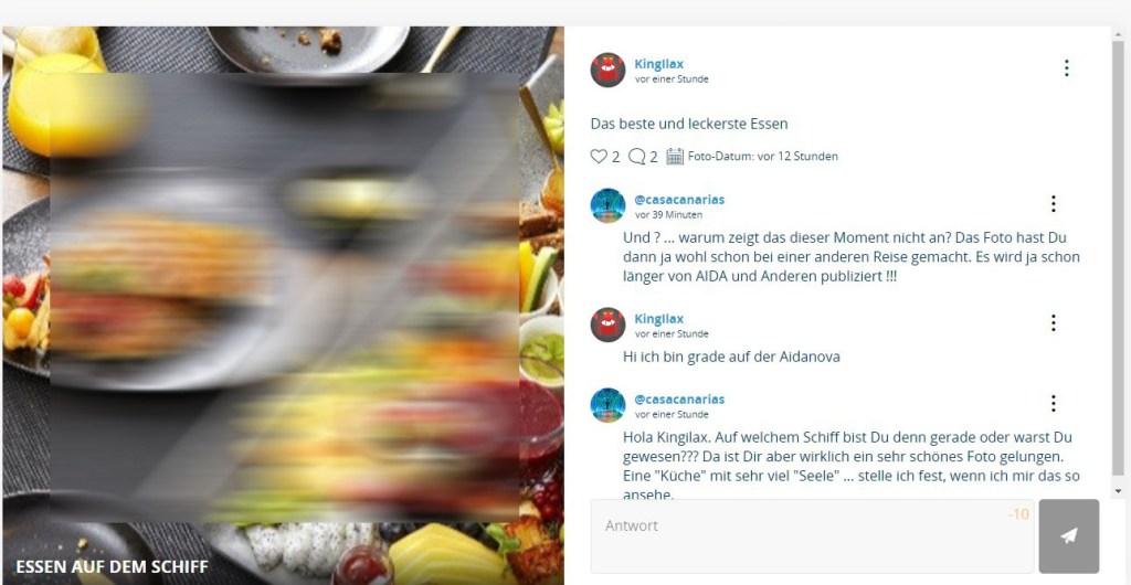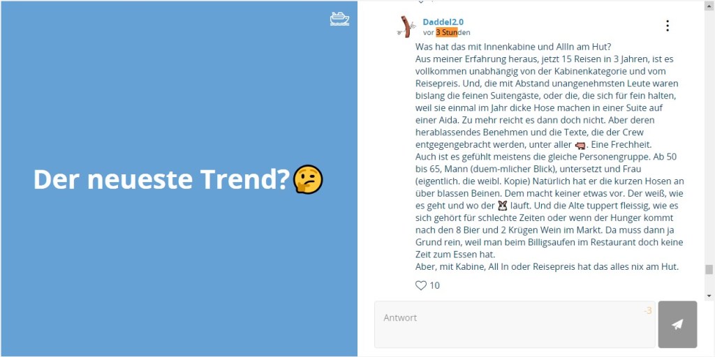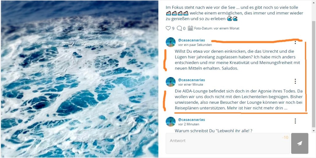 Fast unvorstellbar, dass einmal auch über mehrere Tage hinweg personelle Ressourcen bei Aida vorhanden waren, um in das aggresive Geschehen, vor allem provoziert durch jene Fake-User und ihre Mitläufer, wirkungsvoll einzugreifen. Da gab es hoffnungsvolle Absichtsbekundungen aus Rostock, sogenannte „Fehler“ der IT-Kollegen zu beheben, die eine Funktion betreffen, an der seit Jahren nie gerüttelt wurde.