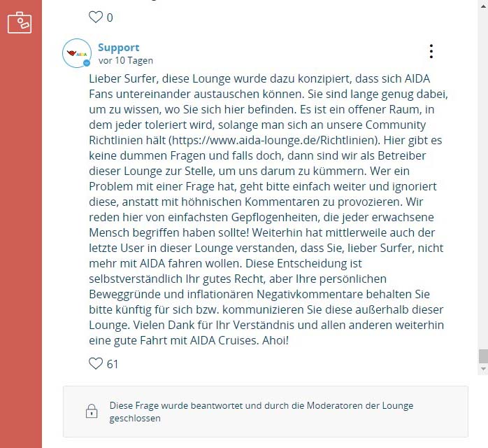 Wenn der Support von AIDA Cruises und somit die Geschäftsführung in ihrer Verantwortung extreme menschenverachtende und ausländerfeindliche Beiträge nicht umgehend und dauerhaft aus der Community fernhalten kann, dann werden eines Tages alle Beteiligten und Betroffenen an diesem Geschehen das Ergebnis bedauern können.