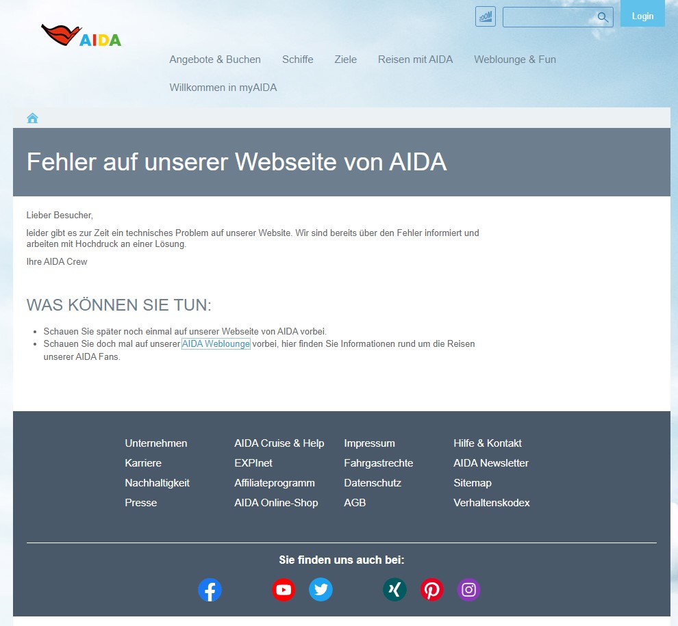Lesen Sie selbst auf dem obigen Screenshot, liebe geschundene Leserinnen und Leser. Ein angeblich nicht existentes Phänomen, wurde „Unfug“ genannt und ist allgegenwärtig. Fatal vernachlässigte Technik ber AIDA, eingebettet in Reinkultur bei der Lounge, Reisebuchungen und MyAIDA funktionieren noch, na ja.. Fangen Sie bitte ganz oben auf dieser Seite an zu lesen. Oder lassen Sie es bitte doch besser.
